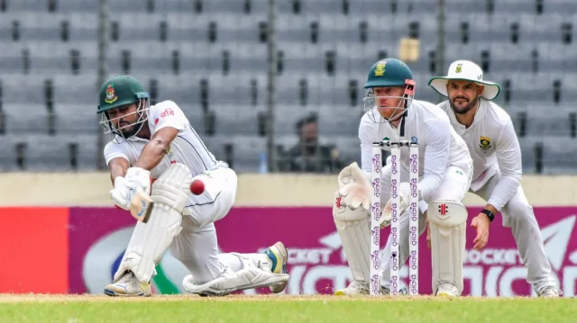 চতুর্থ দিনের শুরুতে ৭ উইকেটে ২৮৩ রান নিয়ে ব্যাট করতে নামে বাংলাদেশ। তবে বেশিক্ষণ টিকতে পারেনি স্বাগতিকরা। ৩০৭ রানে থামে বাংলাদেশের ইনিংস। মেহেদী হাসান মিরাজ আউট হব ৯৭ রানে। প্রোটিয়া পেসার কাগিসো রাবাদা পেয়েছেন ৬ উইকেট। টেস্ট ক্যারিয়ারে ১৫তম বার পাঁচ উইকেটের দেখা পেলেন এই পেসার। দক্ষিণ আফ্রিকার লক্ষ্য দাঁড়িয়েছে ১০৬ রান। চতুর্থ দিনের প্রথম ওভারেই ফিরে যান নাঈম হাসান। রাবাদার নিচু বলে এলবিডব্লিউ হন টাইগার এই ব্যাটসম্যান। এরপর তাইজুল ইসলামও বেশিক্ষণ টিকতে পারেননি। মুল্ডারের বলে স্লিপে ক্যাচ দিয়ে ফেরেন তিনি।